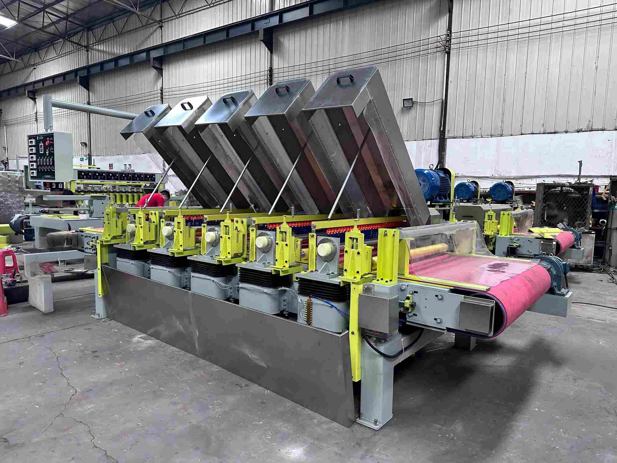 Mesin pembentuk dan pemoles pola gelombang batu ini menggunakan produksi berkelanjutan yang sepenuhnya otomatis dan kontrol PLC, sehingga mampu menghasilkan pola gelombang tiga dimensi pada permukaan batu secara efisien.